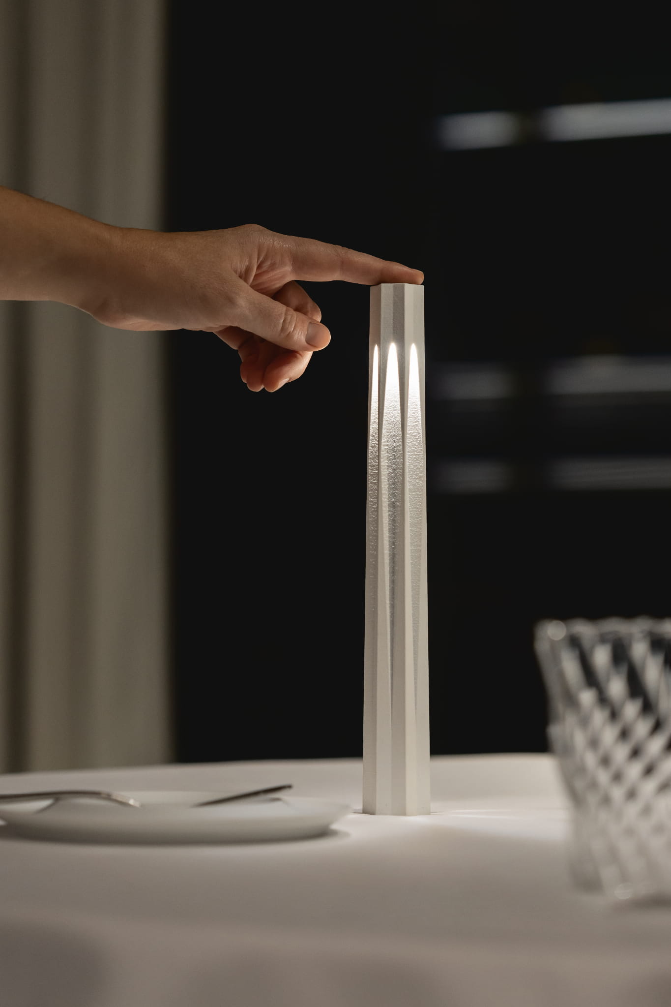 Lampa stołowa Plissè Accento Luce to nowoczesne, bezprzewodowe oświetlenie LED o designerskiej formie inspirowanej strukturą plissé. Dzięki wbudowanemu akumulatorowi i dotykowemu ściemnianiu zapewnia pełną swobodę użytkowania oraz wyjątkowy komfort świetlny.